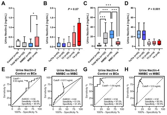 Diagnostic performance of urine Nectin-2 and Nectin-4. (A–D), The levels of urine Nectin-2 and Nectin-4 were compared among healthy controls, patients with BCa, those with NMIBC, and those with MIBC, or according to the T category. Data on urine nectin levels are visualized as box-and-whisker plots. The Mann–Whitney U test was used to compare the levels between the two groups. Two-sided Mann–Whitney U test and Kruskal–Wallis test were used to compare the levels of urine nectin between the two groups and among the four groups, respectively. Asterisks, * and *** indicate statistically significance, p < 0.05 and p < 0.001. (E–H), The diagnostic performance of urine Nectin-2 and Nectin-4 was evaluated using (ROC) curve analyses and the area under the receiver operating characteristic curve (AUROC) values, followed by determination of the optimal cut-off value by calculating the Youden index. Abbreviations: BCa, bladder cancer; NMIBC, non-muscle-invasive bladder cancer; MIBC, muscle-invasive bladder cancer.