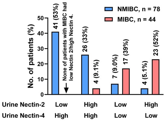 The urine Nectin-2 was higher in MIBC than in NMIBC, whereas the urine Nectin-4 was higher in NMIBC than in MIBC (Figure 1A,C). To evaluate the potential of urine nectins as diagnostic markers to distinguish patients with NMIBC from those with MIBC, we performed ROC analyses and defined specific cutoff values for each nectin (Figure 2F,H). The optimal cutoff values were 0.011 ng/mL for Nectin-2 and 12.0 ng/mL for Nectin-4, providing 61% and 91% sensitivity and 61% and 86% specificity for discriminating NMIBC and MIBC, respectively (Table 2). Four-titer grouping based on the levels of urine Nectin-2/Nectin-4 (low/high, high/high, low/low, and high/low) showed a high discrimination capability for NMIBC and MIBC (Figure 3).