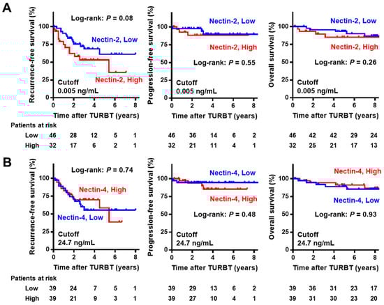 Survival curves after initial transurethral resection in non-muscle-invasive bladder cancer according to the level of Nectin-2 (A) and Nectin-4 (B). The cut-offs for the prognostic performance of urine Nectin-2 and Nectin-4 levels were determined using the median level. In the NMIBC cohort, intravesical recurrence-free survival, progression-free survival, and overall survival from the day of initial TURBT were obtained using the Kaplan–Meier method and compared using the log-rank test. Abbreviations: NMIBC, non-muscle-invasive bladder cancer; MIBC, muscle-invasive bladder cancer; TURBT, transurethral resection of bladder tumors.