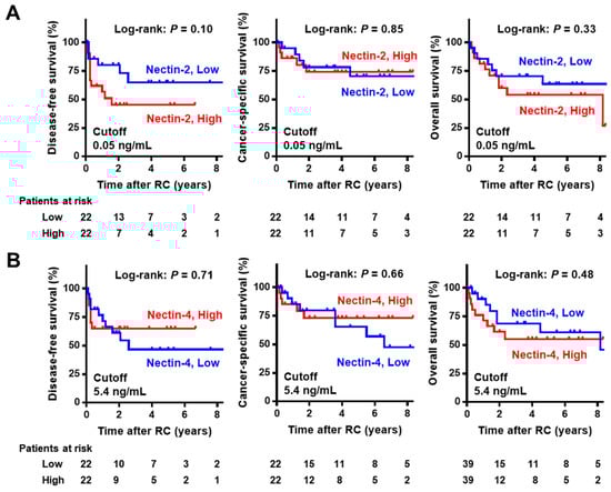 Survival curves after radical cystectomy in muscle-invasive bladder cancer according to the level of Nectin-2 (A) and Nectin-4 (B). The cut-offs for the prognostic performance of urine Nectin-2 and Nectin-4 levels were determined using the median level. In the MIBC cohort, disease-free survival, cancer-specific survival, and overall survival from the day of radical cystectomy were obtained using the Kaplan–Meier method and compared using the log-rank test. Abbreviations: NMIBC, non-muscle-invasive bladder cancer; MIBC, muscle-invasive bladder cancer; RC, radical cystectomy.