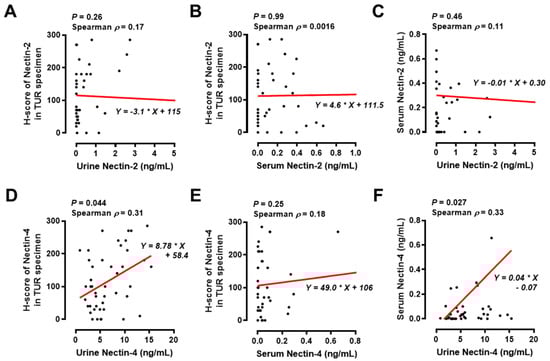 Correlation analysis among urine nectin, serum nectin, and tumor nectin levels in the MIBC cohort. The correlation between urine Nectin-2 and tumor H-score of Nectin-2 (A), between serum Nectin-2 and tumor H-score of Nectin-2 (B), between urine Nectin-2 and serum Nectin-2 (C), between urine Nectin-4 and tumor H-score of Nectin-4 (D), between serum Nectin-4 and tumor H-score of Nectin-4 (E), and between urine Nectin-4 and serum Nectin-4 (F) were examined using Spearman’s correlation and linear regression analysis; p values and Spearman ρ values are shown in figures. The absolute values of Spearman ρ < 0.2–0.4 were considered to indicate slightly correlated. The asterisk in the formula is the multiplication sign. Abbreviations: TUR, transurethral resection.