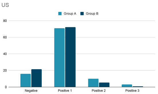 Comparison of US results between the group A and B (numbers are referred to the number of glands described).