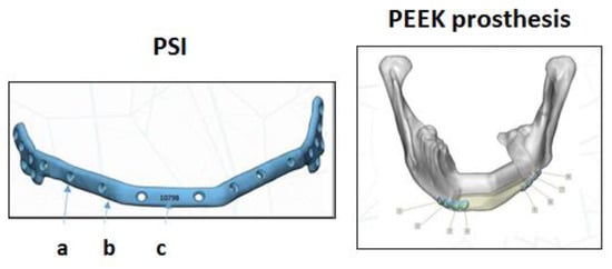 Patient-specific implant (PSI): (a) screw hole with thread; it contains information on the screw angle; (b) an enveloping design to help place the plate in the optimal position; and (c) patient’s information code (left). PEEK prosthesis. Positioning of the PSI in the remaining healthy bone (right).