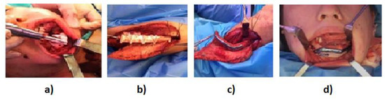 Details of the surgical procedure: (a) mandibular resection; (b) fibula flap modelling; (c) plate binding in the donor zone; and (d) positioning and binding of the flap in the mandibular defect.