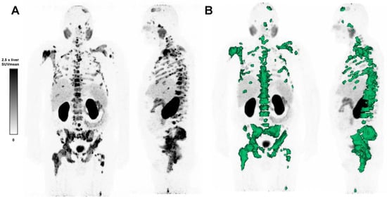 (A) 68Ga-PSMA-11 PET maximum intensity projection image of a patient with advanced mCRPC, and (B) semi-automatic tumor segmentation in that patient using Syngo.via Enterprise VB 60 (Siemens, Erlangen, Germany). The PSMA-positive tumor volume is delineated in green. The SUVmean window was set at 0–2.5 times the SUVmean of the healthy liver.