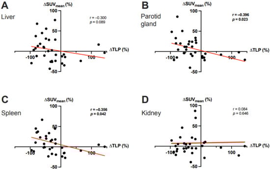 Correlation between the ΔTLP and the ΔSUVmean in (A) the liver, (B) the parotid gland, (C) the spleen, and (D) the kidney after two cycles of 177Lu-PSMA-617 RLT. In panels C and D, 1 outlier each with a ΔSUVmean >100% was cropped to simplify the presentation.