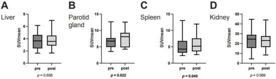 SUVmean at baseline and after two cycles of 177Lu-PSMA-617 RLT in (A) the liver, (B) the right parotid gland, (C) the spleen, and (D) the right kidney in molecular imaging responders to PSMA-RLT (n = 25). Horizontal lines represent the respective median values.