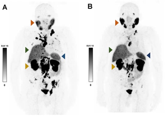 Representative 68Ga-PSMA-11 PET MIP images of an 86-year-old patient with advanced mCRPC who responded to RLT before (A) and after (B) two cycles of 177Lu-PSMA-617. After decreases in TLP (−83%) and serum PSA (−92%), the SUVmean increased in the right parotid gland (ΔSUVmean +32.9%; orange arrow) and the spleen (ΔSUVmean +21.2%; blue arrow), but it was minimally changed in the liver (ΔSUVmean +7.0%; green arrow) and right kidney (ΔSUVmean +0.6%; yellow arrow).