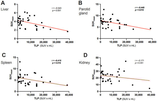 Correlation between the baseline TLP and the baseline SUVmean of (A) the liver, (B) the parotid gland, (C) the spleen, and (D) the kidney in 33 patients with mCRPC.