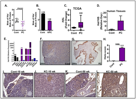 Analysis of circulating His and tissue HAL expression in pancreatic cancer. His levels in serum of PC patients and control subjects were measured (A). Analysis of His in serum of KPC mice and their controls (B). TCGA database shows a significant increase in HAL mRNA in PC patients compared to normal subjects (C). Hal mRNA level was higher in human PC tissue compared to normal tissue (D). Hal mRNA expression in different pancreatic cancer cell lines (E). HAL protein expression in normal (n = 47) (F) and pancreatic cancer tissues (n = 62) (G), and the corresponding histoscore (H). HAL immunostaining is higher in KC mice vs. age-matched controls at 10 (I,J) & 50 wk (K,L). Scale bar = 100 µm. ** p < 0.01, *** p < 0.001 vs. control.