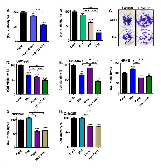 Percentage cell viability and colony forming assay in PC cells. SW1990 cells were cultured in amino acid (AA)-free DMEM F-12 media containing 5% FBS. Percentage cell viability was determined by MTT assay. Cells were treated with His at 10 mM and 25 mM for 72 h (A). Percentage cell viability of SW1990 cells treated with different AAs (25 mM) for 72 h (B). Colony formation assay was performed in His (5 mM)-treated SW1990 and Colo357 cells. A representative well from 3 wells per group is shown (C). Percentage cell viability of SW1990 cells treated with His (25 mM), Gem (10 µM), or His + Gem for 72 h (D). Percentage cell viability of Colo357 cells exposed to His and/or Gem (E). Percentage viability of HPNE cells treated with His (25 mM) and/or Gem (10 µM) for 72 h (F). Percentage viability of SW1990 (G) and Colo357 (H) cells was determined using the Presto blue reagent. Cells were treated with methionine (Met, 25 mM) and/or Gem (10 µM) for 72 h. Values are mean ± SEM of 7–12 samples per group. * p < 0.05, ** p < 0.01, *** p < 0.001 vs. control.
