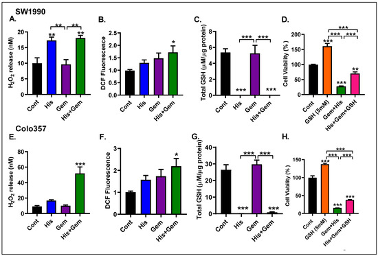 Induction of ROS is an emerging approach for cancer therapy [Reviewed in [28]. To determine whether His + Gem-induced cytotoxicity is due to increased ROS generation and oxidative stress, we first determined the hydrogen peroxide (H2O2) content in the media. We noted a remarkable increase in H2O2 levels in media of SW1990 cells treated with His or His + Gem (p < 0.001) (Figure 3A). Of note, Gem by itself did not raise H2O2 levels. Analysis of DCF fluorescence, which detects many types of ROS, showed a trend towards an increase in Gem- and His-only treated cells and a significant increase (p < 0.05) in cells treated with a combination of both drugs compared to control (Figure 3B). Cellular levels of GSH, an antioxidant, was not altered in Gem-treated cells but were completely depleted in cells treated with His or His + Gem (p < 0.001) (Figure 3C). Interestingly, supplementing media with GSH partly protected against the cytotoxicity induced by a combination of His + Gem (Figure 3D). Together, these data suggest that adding His enhances the cytotoxic effects of Gem against PC cells by depleting GSH and increasing cellular oxidative stress. Regarding Colo357 cells, His-only led to a smaller increase in H2O2 release compared to SW1990 cells (Figure 3E). However, DCF fluorescence and GSH content showed a similar trend as seen in SW1990 cells upon His treatment (Figure 3F,G). As with SW1990 cells, a combination of His and Gem led to a significant increase in these markers of oxidative stress in Colo357 cells (Figure 3E–G), and GSH supplementation partially protected against His + Gem-induced cytotoxicity (Figure 3H).