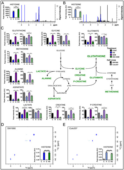 Samples were prepared, and NMR and statistical analyses followed our previous publication [17]. Briefly, SW1990 and Colo357 cells were treated with 25 mM His and/or 10 μM Gem for 24 h. Isotopically labeled experiments were treated with 5 mM [13C15N]- labeled His and 10 μM Gem for 2D NMR analysis. Metabolites were extracted with methanol and water, dried by lyophilization, and reconstituted in 50 mM pH 7.2 phosphate buffer in 99.8% D2O prior to NMR analysis.