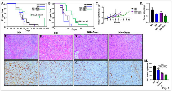 Athymic nude mice (xenograft model of PC) and wild-type mice (syngeneic model of PC) were implanted with SW-1990 cells and UN–KPC960 cells, respectively. Ten days post-implantation, mice were fed a diet containing normal His (NH) or high His (HH) with or without Gem treatment (12.5 mg/kg body weight). Mice were treated with Gem once a week for 4 wk. Survival curves for athymic nude mice (A) and wild-type mice (B) are shown. (n = 10–12/group). Body weight change was measured in tumor-bearing athymic nude mice during the course of the treatment (C). In a separate experiment, athymic nude mice implanted with SW-1990 cells were fed a diet containing normal His (NH) or high His (HH) with or without Gem treatment. After 4 weeks, mice were sacrificed at the same time point and tumor weight was assessed (n = 6–9/group), (D). H + E staining in pancreas sections is shown (E–H). Immunohistochemistry was performed for Ki67 in the pancreas (I–L). Images were captured at 20× magnification. Densitometry of Ki67 is shown (M). * p < 0.05 and *** p < 0.001 vs. NH.