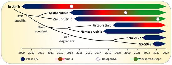 - Mato, A.R.; Wierda, W.G.; Ai, W.Z.; Flinn, I.W.; Tees, M.; Patel, M.R.; Patel, K.; O’Brien, S.; Bond, D.A.; Roeker, L.E.; et al. NX-2127-001, a First-in-Human Trial of NX-2127, a Bruton’s Tyrosine Kinase-Targeted Protein Degrader, in Patients with Relapsed or Refractory Chronic Lymphocytic Leukemia and B-Cell Malignancies. Blood 2022, 140 (Suppl. S1), 2329–2332. [Google Scholar] [CrossRef]