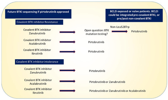 Potential future sequencing of BTKis if pirtobrutinib is approved. Pirtobrutinib represents a good option for patients developing resistance to any of the covalent BTKis—the role of mutation testing to guide therapy remains an open question. There are several options for patients who are intolerant of BTKis. Patients who are intolerant to ibrutinib could switch to a more specific covalent inhibitor or pirtobrutinib; pirtobrutinib is also a potential option for patients intolerant of acalabrutinib or zanubrutinib.