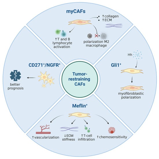 A summary of currently known tumor-restraining CAF subpopulations. Image created with Biorender.com.