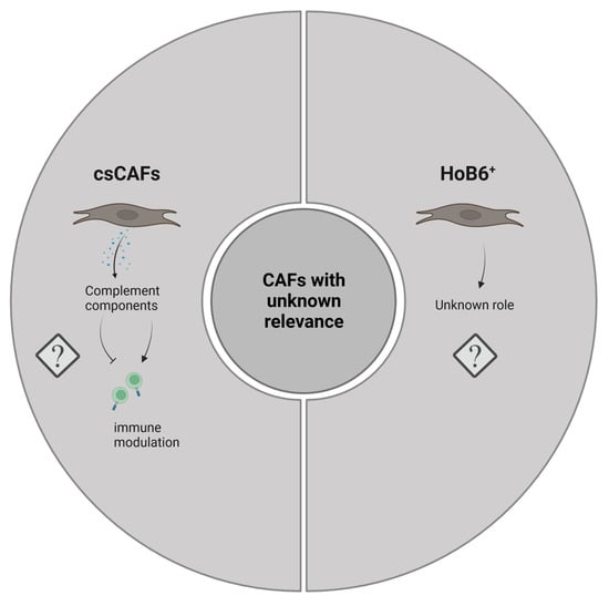 Using single cell transcriptomics, Chen and colleagues were able to identify a new subpopulation of CAFs in the proximity of malignant ductal cells of early-stage PDAC []. These cells expressed many components of the complement system such as C3, C7, CFB, CFD, CFH and CFI; hence, they named these cells complement-secreting CAFs (csCAFs). Potentially, csCAFs may play a role in modulating immune and inflammation responses, but further studies are still needed to reliably link these cells to specific functional processes in PDAC.