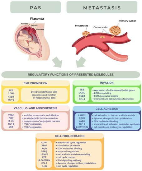 Given the striking parallels between the pathogenesis of PAS and metastasis, and the limited understanding of both conditions, we conducted a study to explore the molecular biomarkers that are involved in the microenvironment of both tumors and placental cells. In this article, we present our review of the following biomolecules: placental growth factor (PlGF), vascular endothelial growth factor (VEGF), E-cadherin (CDH1), laminin γ2 (LAMC2), the zinc finger E-box-binding homeobox (ZEB) proteins, αVβ3 integrin, transforming growth factor β (TGF-β), β-catenin, cofilin-1 (CFL-1), and interleukin-35 (IL-35).