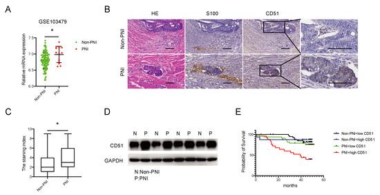 CD51 is upregulated among PNI patients and associated with worse prognosis. (A) The expression level of CD51 is higher among perineural invasion (PNI) patients compared to non-PNI patients in the GSE103479 dataset. * p < 0.05, two-tailed Student’s t-test. (B) Representative images of immunohistochemistry (IHC) show that CD51 is upregulated in PNI patient samples compared to non-PNI patient samples. S100 is used as a specific marker to stain nerve fibers. Scale bars, 100 μm. (C) Statistical result of immunohistochemistry. The staining index of CD51 is presented. * p < 0.05, two-tailed Student’s t-test. (D) Western blotting (WB) analysis of CD51 protein expression in PNI and non-PNI patients’ samples. (E) Kaplan–Meier survival analysis of overall survival (OS) based on patient PNI status and CD51 expression.