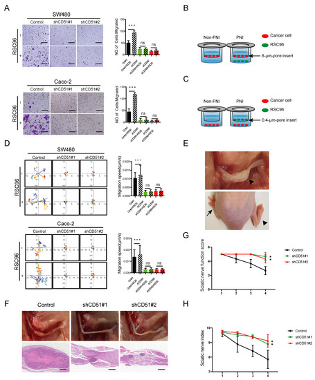 CD51 affects the neurotropism of CRC cells in vitro and in vivo. (A) Statistics and representative images of migration of the shControl and shCD51 SW480 and Caco-2 cells. *** p < 0.001, two-tailed Student’s t-test. Scale bars, 100 μm. (B) Schematic of the co-culture migration assay using 8-μm-pore transwell filters. RSC96 cells or only fetal bovine serum (FBS) were seeded in the lower chamber; meanwhile, CRC cells were added into the upper chamber and then co-culture for 48 h. The migration number of CRC cells was then measured. (C) Schematic of the co-culture migration speed assay using 0.4-μm-pore transwell filters. RSC96 cells or only fetal bovine serum (FBS) were seeded in the upper chamber; meanwhile, CRC cells were added into the lower chamber and then co-culture for 48 h. The speed of CRC cells was then measured. (D) Wind rose plots and statistics of migration speed of the shControl and shCD51 SW480 and Caco-2 cells. Each curve represents a cell trajectory. *** p < 0.001, two-tailed Student’s t-test. (E) The upper shows in situ image of sciatic nerve after injection of SW480 cells. The lower shows representative images of two different functional conditions of the sciatic nerve. The arrow points to the normal hind limb, while the arrowhead marks the functionally impaired hind limb. (F) In situ images of sciatic nerve after injection of shControl or shCD51 SW480 cells for 4 weeks and the corresponding H&E-stained images. Scale bars, 100 μm. (G,H) Statistic of sciatic nerve functions score and sciatic nerve index of mice bearing the shControl or shCD51 SW480 cells for 4 weeks after in situ sciatic injection. ** p < 0.01, two-tailed Student’s t-test.
