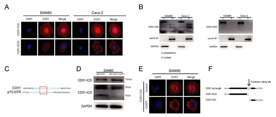 CD51, also known as integrin αv, is a member of the integrin family. As previously reported, integrins regulate downstream functions in a variety of ways, such as conformational changes, protein–protein interactions, and endocytosis, to transmit downstream signals [33]. To explore the mechanism by which CD51 functions, we used the IF assay to investigate the cellular localization of CD51. As shown in Figure 3A, the use of an anti-CD51 intracellular domain (CD51-ICD) antibody marked the expression of CD51 at both the cell membrane and nucleus. We verify antibody specificity by knocking down CD51 and staining it with the ICD antibody. The result showed that the signal intensity significantly decreased after knocking down CD51 (Figure S2A). This suggested that, as a membrane protein, CD51 might also enter the nucleus. Surprisingly, the anti-CD51 extracellular domain (CD51-ECD) antibody only showed binding to antigens on the cell membrane. This phenomenon suggested that CD51 might not enter the cell as a full-length protein but instead was cleaved into different fragments to enter the cell for function. To verify this hypothesis, cytoplasmic and nuclear proteins of SW480 and Caco-2 cells were extracted and detected by WB assay. The results showed that CD51 could be detected in the nucleus using the CD51-ICD antibody, whereas the CD51-ECD antibody failed to detect any specific binding peptide in nuclear-extracted proteins (Figure 3B). This proved that CD51 could be cleaved to generate a small fragment that could enter the nucleus.