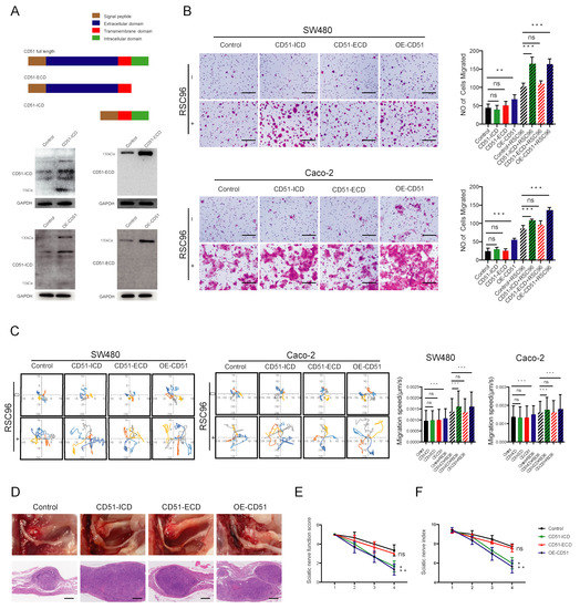 Ectopic overexpression of CD51 ICD also promotes PNI in cancer cells. (A) Schematic diagrams for CD51-ICD, CD51-ECD and OE-CD51 vectors, respectively. WB analysis using the antibody which recognizes the CD51 intracellular and extracellular domain immunogen, respectively, to verify the ectopic overexpression in cancer cell lines. (B) Statistics and representative images of migration of the SW480 and Caco-2 cells transfected with empty vector, CD51 full-length vector, CD51-ICD vector, and CD51-ECD vector. ** p < 0.01, *** p < 0.001, two-tailed Student’s t-test. Scale bars, 100 μm. (C) Wind rose plots and statistical analysis of the migration speeds of the SW480 and Caco-2 cells transfected with empty vector, CD51 full-length vector, CD51-ICD vector, and CD51-ECD vector. Each curve represents a cell trajectory.*** p < 0.001, two-tailed Student’s t-test. (D) In situ images of sciatic nerve after injection for 4 weeks using SW480 cells transfected with empty vector, CD51 full-length vector, CD51-ICD vector, and CD51-ECD vector. In addition, the corresponding H&E-stained images. Scale bars, 100 μm. (E,F) Statistic of sciatic nerve function score and sciatic nerve index of mice after injection for 4 weeks using SW480 cells transfected with empty vector, CD51 full-length vector, CD51-ICD vector, and CD51-ECD vector. * p < 0.05, ** p < 0.01, two-tailed Student’s t-test.