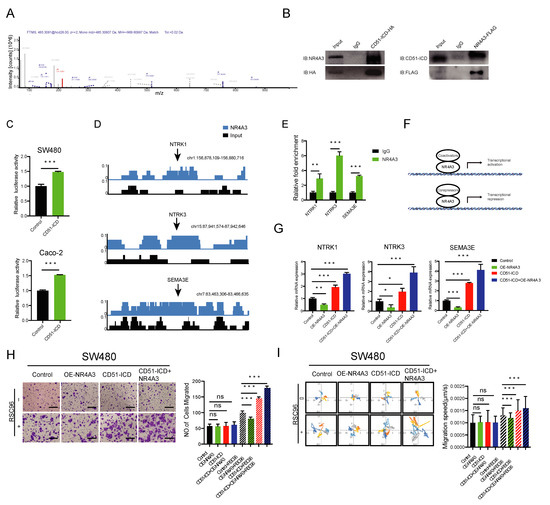 As CD51-ICD could be detected in the nucleus, we suspected that it could directly bind to the chromatin to regulate downstream signaling. However, we failed to detect any specific DNA signal in our chromatin immunoprecipitation (ChIP) assay. Next, we speculated whether CD51-ICD could bind to other proteins to act as an indirect regulatory factor, as other protein ICDs have been reported previously [36]. Therefore, we performed a co-immunoprecipitation (Co-IP) assay and mass spectrometry analysis in 293T cells stably transfected with the CD51-ICD-HA vector. Proteins potentially interacting with CD51-ICD were immunoprecipitated using magnetic beads coated with anti-HA antibody. After excluding non-specific binding proteins from the IgG control, 78 proteins were identified. The proteins that interact with CD51-ICD are listed in Table S3. Among these proteins, we focused on discovering related factors involved in transcriptional regulation and found the only non-general transcription factor, NR4A3 (Figure 5A) [37]. Next, we further validated the interaction using Co-IP and reverse IP assays on CD51-ICD and NR4A3, and the results showed that CD51-ICD and NR4A3 can bind to each other (Figure 5B). To confirm whether the interaction could regulate the transcriptional activity of NR4A3, NR4A3-binding regulatory elements were cloned into the pGL4 luciferase reporter vector and then transfected into CRC cells overexpressing empty vector or ICD vector for luciferase reporter assay. The results showed that CD51-ICD overexpression enhanced the luciferase activity of the NR4A3 reporter (Figure 5C). Collectively, CD51-ICD bound to NR4A3 in the nucleus and regulated its transcriptional activity.