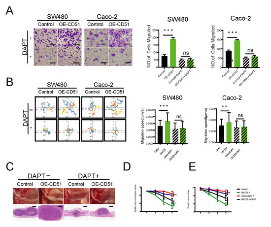 Pharmacological inhibition of γ-secretase impedes PNI in vitro and in vivo. (A) Statistics and representative images of the migration of SW480 and Caco-2 cells toward RSC96 cells with and without the γ-secretase inhibitor DAPT. *** p < 0.001, two-tailed Student’s t-test. Scale bars, 100 μm. (B) Wind rose plots and statistics of the migration speed of SW480 and Caco-2 cells stimulated by RSC96 cells with and without the γ-secretase inhibitor DAPT. Each curve represents a cell trajectory. ** p < 0.01, *** p < 0.001, two-tailed Student’s t-test. (C) In situ images of the sciatic nerve after injection for 4 weeks using SW480 cells transfected with empty vector or CD51 full-length vector. In addition, the corresponding H&E-stained images. Tumor-bearing mice were fed either with or without DAPT added to the diet. (D,E) Statistic of sciatic nerve function score and sciatic nerve index of mice after injection for 4 weeks using SW480 cells transfected with empty vector or CD51 full-length vector. Tumor-bearing mice were fed either with or without DAPT added to the diet. * p < 0.05, two-tailed Student’s t-test.