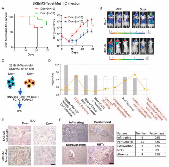 In our previous study, we generated two tetracycline-inducible c-Met knockdown cells from 231BrM and SKBrM3, two brain tropical cell lines, and found that knockdown of c-Met in 231BrM-Tet-shMet cells by feeding mice with doxycycline water significantly suppressed brain metastasis in vivo []. In this study, we validated our previous findings by using the SKBrM3-Tet-shMet cells (Figure 1A,B). To further investigate how the c-Met pathway regulates brain metastasis, we performed Ingenuity Pathway Analysis (IPA) by analyzing the top 200 c-Met signature genes generated from 231BrM-Tet-shMet cells and SKBrM3-Tet-shMet cells with or without knockdown of c-Met (Figure 1C). Interestingly, we found that TREM1 and GM-CSF signaling pathways which are known to play pivotal roles in neutrophil maturation and survival, were ranked as one of the most enriched pathways []. In addition, signaling pathways involved in granulocyte adhesion and crosstalk between innate and adaptive immune cells were also identified (Figure 1D). These data strongly suggest that activation of c-Met signaling in brain metastatic tumor cells is associated with an atypical neutrophil activity which may influence tumor growth in the brain. To further validate our findings, we stained brain metastatic samples from mice inoculated with 231BrM-Tet-shMet and SKBrM3-Tet-shMet using neutrophil elastase (ELA2) antibody, a highly specific neutrophil marker. As shown in Figure 1E, the knockdown of c-Met significantly reduced the amount of infiltrated neutrophils in the metastatic lesions. We also stained clinical samples (n = 26) derived from brain metastatic lesions with ELA2 antibody and observed the presence of neutrophils in ~80% of brain metastatic samples with different patterns (Figure 1F). We also found that most of the neutrophils were presented in the peritumoral area, followed by infiltrating and extravasation phenotypes. Under certain conditions, neutrophils respond to pro-inflammatory stimuli by forming web-like structures composed of histones and decondensed chromatin, collectively termed Neutrophil Extracellular Traps (NETs). Growing evidence has shown that NETs promote tumor growth and metastasis in various types of cancers [,]. Notably, NETs were found in two samples, suggesting a potential role of NETs in promoting brain metastasis. Based on these observations, it is clear that neutrophils are presented in the brain metastatic lesions, and their activities are associated with c-Met expression in tumor cells.