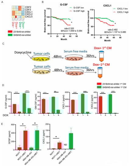 Neutrophils are differentiated from granulocyte–monocyte progenitors in the bone marrow under the direction of G-CSF or GM-CSF and then released to the circulation followed by CXCL1/2/5/8 mediated signaling []. We examined the expression of these factors in our RNA sequencing data and found that the knockdown of c-Met significantly downregulated the expression of G-CSF, GM-CSF, CXCL1, and CXCL2 but not CXCL5 (Figure 2A). In a combined cohort of breast cancer patients, c-Met expression is positively correlated to G-CSF, GM-CSF, CXCL1, and CXCL2 (Figure S1A). We also found that high expression of G-CSF and CXCL1 but not GM-CSF or CXCL2, in primary tumors is significantly correlated with poor brain metastasis-free survival (Figure 2B and Figure S1B). Since communications between neutrophils and cancer cells are mainly through systemic effect mediated by cytokines, we prepared conditioned medium (CM) from cancer cells with (Dox+) or without (Dox−) knockdown of c-Met followed by measuring cytokine concentration by ELISA (Figure 2C,D). Indeed, the knockdown of c-Met in two brain metastatic cells significantly reduced the secretion of G-CSF, GM-CSF, CXCL1, and CXCL2 (Figure 2D). We also found that overexpression of c-Met in MCF7 and MDA-MB-453 significantly increased G-CSF and CXCL1 but not GM-CSF concentration in CM, while the amount of CXCL2 was not detectable (Figure 2E and Figure S1C).
