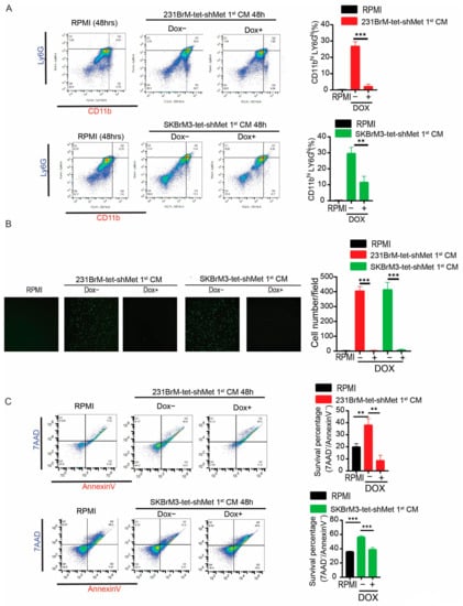 For the preparation of the 1st CM from tumor cells, 231BrM-tet-shMet and SKBrM3-tet-shMet cells were cultured in medium with doxycycline (1 µg/mL) prior to CM preparation. Forty-eight hours later, the Dox−containing medium was replaced with serum-free DMEM. Thirty-six hours later, CM was collected, and cell debris was removed by centrifugation. For secondary neutrophil CM, 1 million neutrophils were seeded in cancer cell CM for 36 h. The medium was then collected, and cell debris was removed by centrifugation.