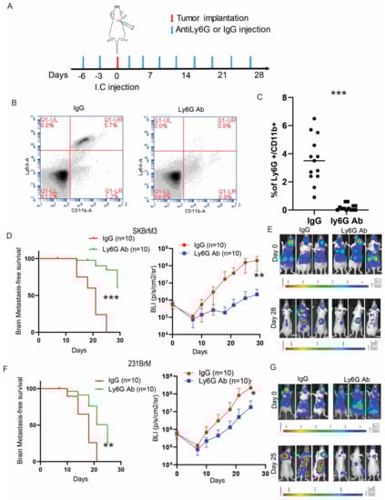To examine whether neutrophils contribute to brain metastasis in vivo, we depleted neutrophils by Ly6G antibody in nude mice one week prior to the inoculation of brain metastatic cancer cells (Figure 4A). Successful depletion of neutrophils in the circulation was confirmed by Ly6G/CD11b FACS (Figure 4B,C). Indeed, the depletion of neutrophils significantly prolonged the survival of mice inoculated with SKBrM3 (Figure 4D,E) and 231BrM (Figure 4F,G) cells with decreased tumor burden in the brain. Several groups reported that neutrophils promote cancer metastasis by facilitating cancer extravasation, enhancing the survival of circulating tumor cells, and inducing angiogenesis. Interestingly, the depletion of neutrophils also significantly reduced the bone metastasis burden, suggesting a general role of neutrophils during tumor metastasis.