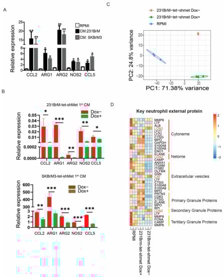 Studies have shown that neutrophils can either have suppressive (N1) or supportive (N2) roles in tumor progression, depending on the populations identified in the tumor microenvironment [,]. CCL2, ARG1, ARG2, NOS2, and CCL5 are well-known N2-associated cytokines that promote tumor growth, invasion, and immune suppression. We found CM from brain metastatic cells significantly upregulated expression of N2 cytokines in neutrophils compared to RPMI medium, and knockdown of c-Met in cancer cells attenuated this effect (Figure 5A,B). To gain a deeper understanding of the transcriptomic remolding in those neutrophils and whether such remolding depends on c-Met signaling in tumor cells, we performed RNA sequencing in mouse neutrophils treated with CM of 231BrM-tet-shMet cells with or without knockdown of c-Met. Among the 39,175 genes identified, 11,868 genes showed significant differential expression between DOX− CM and DOX+ CM treated neutrophils (Figure S3A, Table S2). Principle analysis also demonstrated unique transcriptome profiles between cells treated with different CM (Figure 5C). Neutrophils mainly interact with other cells through external proteins and cytokines []. Therefore, we examined the expression of neutrophils’ external proteins, including granule proteins, netome, cytonme, and extracellular vesicles containing proteins from neutrophils []. Surprisingly, we observed overall downregulation of these genes except lipocalin 2 (LCN2) and catalase (CAT) in DOX− CM treated neutrophils compared to DOX+ CM treated or not treated neutrophils (Figure 5D). Among the 39 neutrophil-secreted cytokines, 18 showed differential expression between DOX− CM and DOX+ CM treated neutrophils (Figure S3B). Our data indicate that the release of c-Met-dependent cytokines from brain metastatic cells reprograms the neutrophils towards the N2 phenotype through key genes that are associated with neutrophil activities and homeostasis.