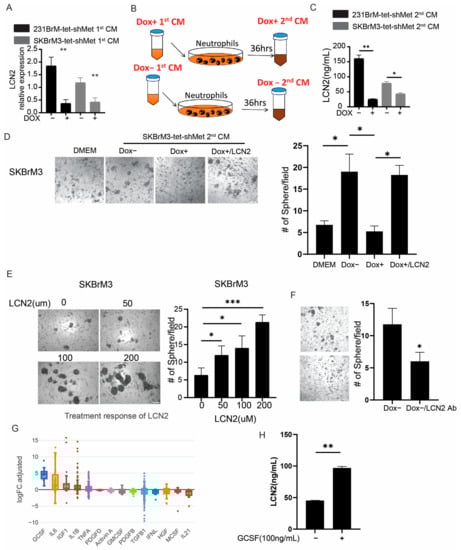 To examine how N2 neutrophils promote brain metastasis, we selected three genes from the RNA sequencing data, including LCN2, CAT, and PROK2 (BV8), that showed significant upregulation in DOX− CM compared to DOX+ and not treated cells. LCN2 and BV8 but not CAT expression, were validated by qRT-PCR (Figure 6A and Figure S4A). BV8 secreted from neutrophils has been reported to promote angiogenesis by activating endothelial cell proliferation [,]. However, the tube formation ability of mouse brain endothelial cells was not affected by the treatment of DOX− 2nd or DOX+ 2nd CM from neutrophils (Figure 6B and Figure S4B). This might be due to the DOX+ 1st CM-treated neutrophils having high expression of VEGFA, which rescued the pro-angiogenic effect of DOX+ 2nd CM (Figure S3B). Because most of the brain metastatic cells are highly invasive, the co-culture of neutrophils failed to further enhance the migration ability of brain metastatic cells (Figure S4C). Recent studies have shown that extracellular LCN2 enhances the stemness of cancer cells by elevating iron uptake [,]. We first confirmed the secretion of LCN2 from neutrophils by ELISA and found that DOX− CM significantly increased the amount of LCN2 secretion by neutrophils compared to DOX+ CM treatment (Figure 6C). Next, we performed a mammary sphere formation assay to examine whether neutrophils promote cancer stemness by LCN2. First, we pretreated cancer cells with DMEM, DOX− 2nd CM, DOX+ 2nd CM, and DOX+ 2nd CM with recombinant LCN2, followed by mammosphere formation. Indeed, mammosphere formation of tumor cells was significantly upregulated by the DOX− 2nd CM compared to DOX+ 2nd CM-treated cells, and recombinant LCN2 rescued mammosphere formation in DOX+ 2nd CM-treated cells (Figure 6D). Next, we pretreated cancer cells with a gradient concentration of LCN2 and found that LCN2 promotes cancer cell sphere formation in a concentration-dependent manner (Figure 6E). We also found that the addition of LCN2 neutralizing antibodies significantly reduced the mammary sphere formation ability of DOX− 2nd CM treated SKBrM3 cells. These data suggest that neutrophil-derived LCN2 promotes the stemness of brain metastatic cell lines. To identify which c-Met-regulated cytokines regulate LCN2 expression in neutrophils, we used the Cytosig database, which reveals cellular response to specific signaling molecules obtained from publicly available data []. The results showed that G-CSF is the major cytokine that upregulates LCN2 expression (Figure 6G). To validate our findings, we treated neutrophils with G-CSF followed by LCN2 ELISA and found an increased amount of LCN2 in the CM upon G-CSF stimulation (Figure 6H). These data suggest that c-Met-mediated G-CSF secretion in cancer cells elevates LCN2 expression in neutrophils.