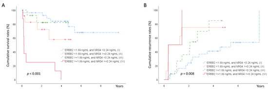 Kaplan–Meier curves for cumulative survival of the four groups, based on serum levels of ERBB2 and NRG4. (A) The group with elevated serum levels of both ERBB2 and NRG4 had a lower survival rate compared with that of the other groups (IV vs. II, p = 0.007; IV vs. I, III, p < 0.001). (B) Kaplan–Meier curves for cumulative recurrence for the four groups, based on serum levels of ERBB2 and NRG4. The group with elevated serum levels of both ERBB2 and NRG4 had a higher HCC recurrence compared with that of the groups with low serum NRG4 (IV vs. III, p = 0.030; IV vs. I, p = 0.002; IV vs. II, p = 0.840). (Abbreviations: ERBB2, erythroblastic leukemia viral oncogene homolog 2; NRG4, neuregulin 4; HCC, hepatocellular carcinoma).