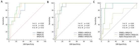 Graphs (A–C) present the receiver operating characteristic curves for the prediction of 6-month mortality. (A) The single factors, such as ERBB2, NRG4, and MIG6, were compared to each other, and (B) multiplied values were also compared. Although the comparison between single factors and the comparison between multiplied values did not show a significant difference, (C) the product of ERBB2 and NRG4 with MIG6 (AUC 0.940)/without MIG6 (AUC 0.942) showed superior results in AUC compared to the results for alpha-fetoprotein (AUC 0.727). (ERBB2, erythroblastic leukemia viral oncogene homolog 2; NRG4, neuregulin 4; MIG6, mitogen-inducible gene 6; AUC, area under the curve; red dotted line in the figure, random classifier).