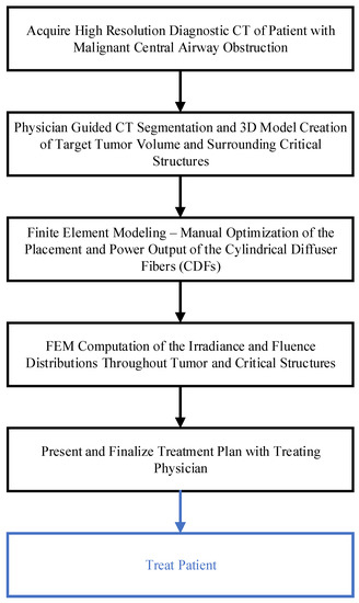A step-by-step schema in Figure 1 describes the FEM-based treatment planning of the light delivery during I-PDT of MCAO. The personalized treatment plans indicate the number, location, and light settings of the CDFs needed to deliver a prescribed light irradiance and fluence to the target tumor volume. In this study, our goal was to deliver our preclinical suggested effective rate-based light dose (i.e., 8.6 mW/cm2 and 45 J/cm2) to a significant part of the target tumor volume. For patients’ personalized treatment planning, high-resolution diagnostic CT or MRI scans were acquired 1–2 weeks prior to I-PDT. These scans were imported into an image visualization and analysis software package (Simpleware, Exeter, UK) and used to manually segment the tumor, adjacent normal tissues, blood vessels, and other important anatomical features defined by the treating physician. The segmented scans were then reconstructed to create a 3D computer-aided design (CAD) model that was imported into the Comsol FEM package. In Comsol, cylindrical representations of the CDFs were virtually placed within the tumor volume. A tetrahedral mesh of the entire geometry, which included the tumor, the CDFs, surrounding normal tissue, and critical structures, was created in Comsol using its mesh generator with our previously determined optimal mesh parameters defined in [23].
