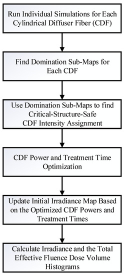 Dosie has been specifically designed to help with the process of manually optimizing the CDFs output intensities and treatment times and provide a framework for computational analysis and visualization. Using predetermined CDF coordinate locations within the tumor geometry, Dosie can be applied to optimize the power output (or, equivalently, the intensity at each point of a CDF) and the treatment time for each CDF by using a new method we term domination sub-maps. This optimization is performed for each CDF by maximizing its power output in a sub-region where the resulting irradiance from such CDF “dominates” the irradiances generated by other CDFs. The steps of this method are outlined in Figure 2. First, simulations are run in Dosie, where laser light is emitted from only one CDF at a time and the resulting irradiance distribution map throughout the tumor geometry and surrounding major blood vessels (≥4 mm in diameter) is computed for each CDF. For these simulations, the power outputs from the CDFs are initially set to the same value. The resulting irradiance maps are then combined to determine the domination sub-maps for each CDF. The CDF domination sub-map is defined over a sub-region within the 3D tumor geometry and surrounding critical structures, where the light irradiance delivered from that CDF is at its maximum when compared to the other CDF irradiance distributions. For example, if there are four CDFs (A, B, C, and D), the domination sub-map of map with regard to maps , , and is defined as follows (per each position within the tumor, , or critical structure, , geometries):