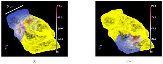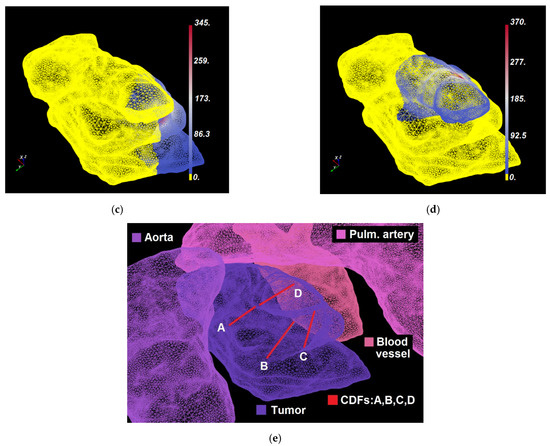 Figure 3a–d shows representative domination sub-maps (for the tumor only; the surrounding critical structures are not shown) for one patient with MCAO for all CDFs, and Figure 4a shows a domination sub-map in the tumor and surrounding pulmonary artery, aortic arch, and blood vessels for one of the CDFs. Once the domination sub-maps for each CDF have been determined, the maximum irradiances throughout the critical structures within each domination sub-map are checked, such that the irradiance delivered to those structures from different CDFs will not exceed the effective irradiance of 8.6 mW/cm2.