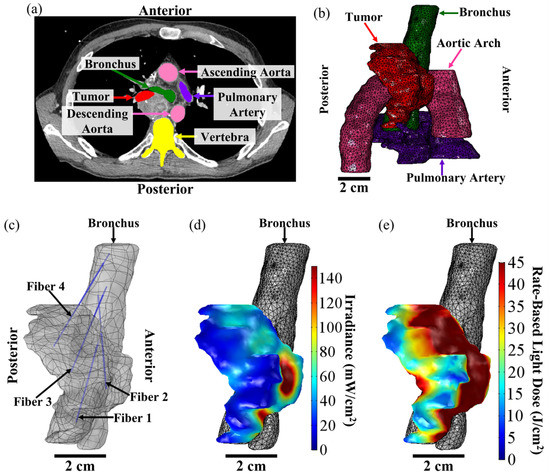 FEM-Based Treatment Plan for I-PDT of MCAO. The above figure shows a representative treatment plan and simulation results for a patient with MCAO that was treated with I-PDT. (a) High-resolution diagnostic CT scan. The treating physician segmented the tumor treatment volume (in red) and then the surrounding critical structures were segmented. The total tumor volume was 26.1 cm3. For this patient, segmentations were performed for the pulmonary artery (in purple), ascending and descending aorta (in pink), bronchus (in green), and vertebra (in yellow), and then for the tissue surrounding the tumor (not shown). These segmentations were used to create 3D CAD models that could be imported into the FEM software, which in this case was Comsol. (b) Three-dimensional mesh of the tumor (in red), pulmonary artery (in purple), aortic arch (in pink), and bronchus (in green). The mesh was created from the 3D CAD models in Comsol and used for our FEM simulations of light distribution. For this patient, the light irradiance and fluence distribution was computed for the tumor, surrounding normal tissue, pulmonary artery, and the aortic arch. (c) Fiber placement from the bronchus and into the tumor geometry. The plan was to insert 4 CDFs with illumination lengths of 1.5 cm. Each fiber would emit 240 mW/cm for 750 s. (d) Resulting irradiance distribution. Based on the treatment plan, 99.97% of the tumor volume would receive ≥8.6 mW/cm2. The irradiance ranged 7–1528 mW/cm2. (e) Resulting rate-based light dose (the total fluence calculated when the irradiance ≥ 8.6 mW/cm2). Based on the treatment plan, 79.6% of the tumor volume would have received the effective rate-based light dose (i.e., ≥8.6 mW/cm2 and 45 J/cm2). This volume of the tumor is indicated in red in (e).