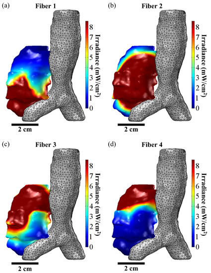 A representative example of the Comsol FEM-based treatment planning for light delivery during I-PDT for a patient with MCAO is shown in Figure 5. A CT scan of the patient was used to segment out the tumor, pulmonary artery, aortic arch, bronchus, vertebra, and the surrounding normal tissue. For this patient, the tumor volume was 26.1 cm3. Based on the FEM simulations, four CDFs with an illumination length of 1.5 cm and each delivering 240 mW/cm were required in order to deliver ≥8.6 mW/cm2 to 99.97% of the tumor volume. Figure 6 shows the resulting light irradiance distribution for each CDF placement that was determined using the Comsol optimization. In the 3D irradiance distributions for the tumor volume, anything in red received ≥8.6 mW/cm2. For this patient, the treatment time was set to 750 s per fiber placement. Based on the four fiber placements, the patient would have received the effective rate-based light dose to 79.6% of the tumor volume. The maximum irradiance and fluence delivered to the pulmonary artery were 7.6 mW/cm2 and 6.0 J/cm2. The maximum irradiance and fluence delivered to the aortic arch were 0.6 mW/cm2 and 0.5 J/cm2.