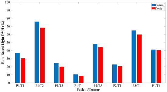 Of the four patients, one patient had five different tumor locations while the other three patients had one tumor location. Tumor volumes ranged from 0.7–26.1 cm3. Figure 7 shows the resulting rate-based light dose DVH for the tumor geometries that were computed from the Comsol and Dosie FEM simulations. The irradiance dose rate volume histogram (DRVH) is defined and computed as the percent tumor volume that received ≥8.6 mW/cm2. The effective rate-based light dose DVH is defined and computed as the percent tumor volume that received ≥8.6 mW/cm2 and ≥45 J/cm2. There was near perfect agreement between the two FEM software when calculating the intratumoral irradiance DRVH with a CCC of 0.999, 95% CI (0.996, 0.999). There was very good agreement between the two FEM software when calculating the effective rate-based intratumoral light dose DVH with a CCC of 0.977, 95% CI (0.916, 0.987).