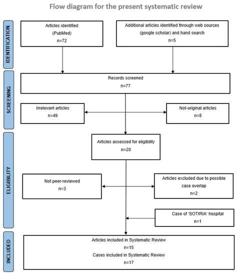 Of the seventy-seven articles initially retrieved through the literature search, fifteen met all eligibility criteria and were included in the systematic review [15,16,17,18,19,20,21,22,23,24,25,26,27,28,29]. One additional unpublished case from the Third Department of Internal Medicine, Sotiria General Hospital for Chest Diseases, National and Kapodistrian University of Athens, Athens, Greece, was also included. Two retrospective studies, reporting a further seventeen cases, were excluded due to possible overlap with other cases included in our study, after unsuccessful communication with corresponding authors [30,31]. Overall, seventeen cases were included in the systematic review and descriptive analysis. The PRISMA 2020 flow diagram for systematic reviews and meta-analyses of studies selection is illustrated in Figure 1.