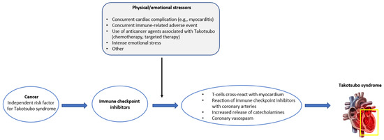 Graphical illustration of the proposed series of events leading to Takotsubo syndrome in cancer patients treated with immune checkpoint inhibitors.