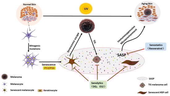 Melanocytes and keratinocytes in the skin can provide protection against oxidative damage caused by UV exposure. However, excessive UV exposure can not only damage skin cells and promote skin aging but also increases the probability of the occurrence of melanocyte mutations, thereby increasing the risk of melanoma. The process of melanocytes developing into melanomas usually includes the following stages: malignant proliferation caused by a mitotic mutation, cellular senescence, and senescence escape. In the process of skin aging, senescent cells, such as melanocytes and fibroblasts, also gradually accumulate. In addition, some treatment methods may also induce the senescence of melanoma cells. These senescent cells create an immunosuppressive microenvironment by senescence associated secretory phenotype (SASPs), which promote the occurrence, development, and drug-resistance behaviors of melanoma cells. Therefore, drugs that selectively eliminate senescent cells (senolytics) or regulate SASP (senostatics) present potential effects for the treatment of melanoma. Some senolytic and senostatic drugs, such as DQ (Dasatinib + Quercetin), ES2, and resveratrol had a positive effect on the treatment of melanomas in different models. TIS: therapy-induced senescence.