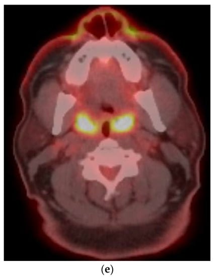 To improve PET/CT performance for response assessment and disease monitoring, semi-quantitative evaluation methods have been proposed. Namely, standardized uptake values (SUVs) have been utilized to quantitatively characterize imaging findings. Kim et al. demonstrated decreased survival in 221 patients with OPSCC on pretreatment PET with advanced age >60 years; advanced tumor stage; and high tumor SUVmax, SUVpeak, metabolic tumor volume (MTV) and total lesion glycolysis (TLG) [30]. Parameters for 18F-FDG-PET/CT are lower in HPV-positive than in HPV-negative patients [31]. In one study, the maximum SUV in HPV-positive tumors was 3.9 units lower than in HPV-negative tumors. Nodal PET/CT parameters, however, were found to be higher in the HPV-positive group [32]. However, the use of SUVmax is felt to be a surrogate for advanced stage and has not demonstrated accuracy in predicting patient outcome [33]. The exact metabolic parameters remain unclear [34]. MTV and TLG are felt to be superior to SUVmax as prognostic biomarkers to predict outcome in patients with head and neck cancer [35]. Thus, qualitative interpretation criteria continue to be used [36]. Such qualitative criteria include the size and location of any abnormal uptake, where a decrease in size or intensity indicates treatment response and an increase indicates disease progression. Other criteria include the presence or absence of new abnormal uptake, as well as the overall uptake distribution within the region. As noted, inflammatory changes in the treatment area may contribute to false-positive follow-up interpretations (Figure 3a and Figure 4). Conversely, post-treatment changes such as tissue necrosis may lead to false-negative results [28] (Figure 3b). Potential confounding tissue changes must thus be carefully considered during interpretation of PET/CT follow-up, and correlation with clinical and lab-based indices of response is recommended. Nodal detection may be improved by using a nodal SUVmax and nodal SUVmax/liver SUVmax in the pre-operative detection of metastatic nodes. The latter is considered superior to visual inspection as it may correct for inter-scanner variability [37].