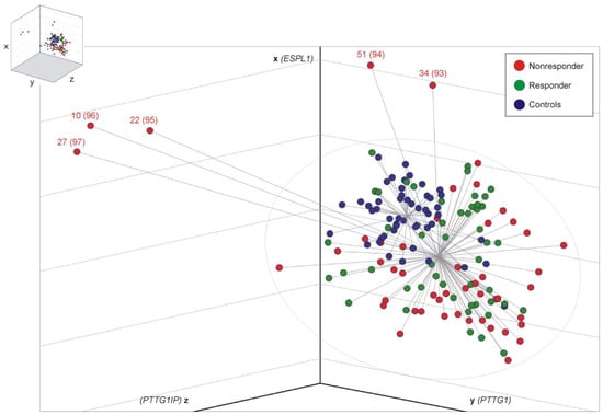 3D scatter plot illustration of 148 analyzed samples. Relative transcript level data (ΔCt values) of the genes ESPL1 (x-axis), PTTG1 (y-axis) and PTTG1IP (z-axis) was arranged in the three-dimensional room with a center for healthy controls (blue, n = 51) and a common center for CML R (green, n = 46) and NR samples (red, n = 51). Logistic regression and analysis of maximum likelihood estimates revealed a positive correlation of distance with MMR failure (p = 0.0388, odds ratio 1.479, 95% Wald confidence limits: 1.020 to 2.143). The ellipsoid in grey symbolizes the cut-off (distance) of 5.9180; then, the test reached 100% specificity, as outlined in Table 2. Therefore, about 10% (5 of 51) of the NR samples could have been predicted correctly at the time of ID. The first numbers refer to the patient data in Supplementary Table S1, and the numbers in brackets refer to Table 2. Statistical analysis: the MEANS, TTEST (Satterthwaite approximation), and LOGISTIC (Fisher’s scoring, Wald testing) procedures used SAS Version 9.4.