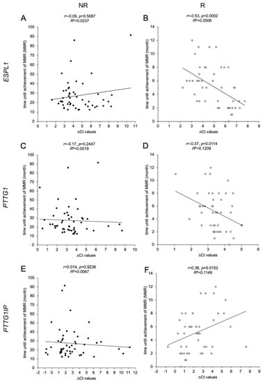 We have investigated potential correlations between time until the achievement of MMR and the gene expression levels of ESPL1, PTTG1 and PTTG1IP (Figure 2). For the R cohort, negative correlations were found for the ΔCt values of ESPL1 (p = 0.0002, panel B) and PTTG1 (p = 0.0114, panel D). Due to the inverse correlation, this indicates that a lower gene expression of the ESPL1 and PTTG1 correlates with a faster achievement of MMR. In contrast, ΔCt values of PTTG1IP (p = 0.0152, panel E) correlated positively with time until the achievement of MMR, indicating that a higher expression of PTTG1IP correlates with a faster response to therapy. In contrast, the NR cohort did not show any relation regarding the gene expression levels.