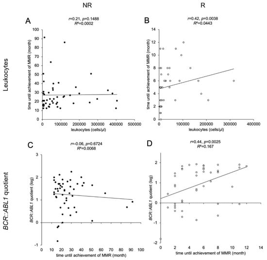 Correlations of leukocyte counts and BCR::ABL1 quotients with time until the achievement of MMR in CML patients. Scatter plot illustrations of 97 analyzed samples (non-responders (NR) as black dots, n = 51, (A,C)); responders (R) as white dots, n = 46, (B,D)). The illustrations show the association between time until the achievement of MMR (y-axis in A, B; x-axis in (C,D)) in CML patients with leukocytes at ID (x-axis; (A,B)) and BCR::ABL1 quotient at ID (y-axis; (C,D)). Each data point in the illustration represents one examined patient. Time until the achievement of MMR, leukocyte count at ID and BCR::ABL1 quotient were derived from the patient database (LeukDB) of the laboratory for leukemia diagnostics of the III. Medical University Clinic Mannheim. Statistical analysis: MEANS, Spearman correlation coefficient, effect size r, and coefficient of determination R2.